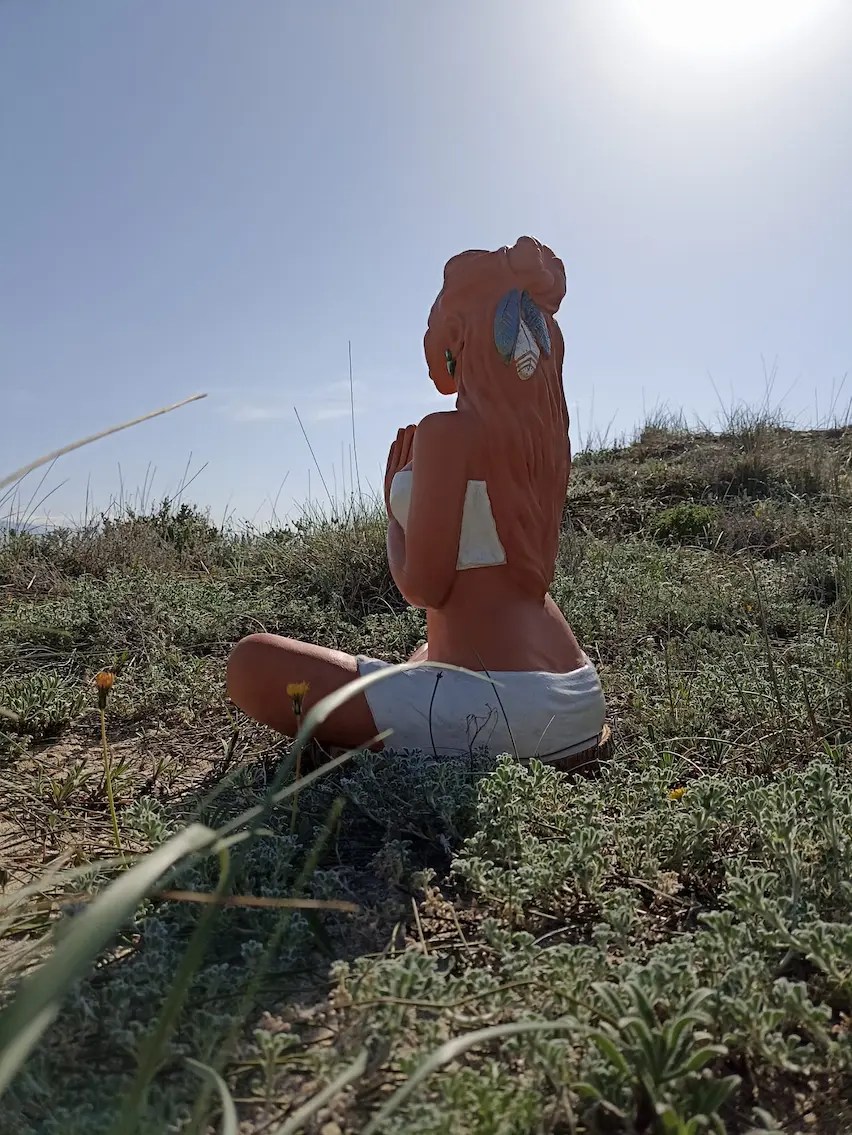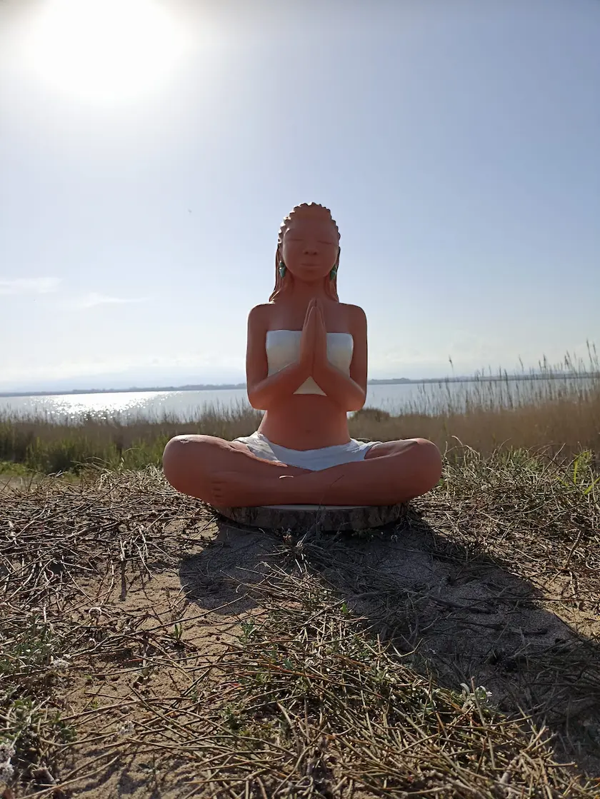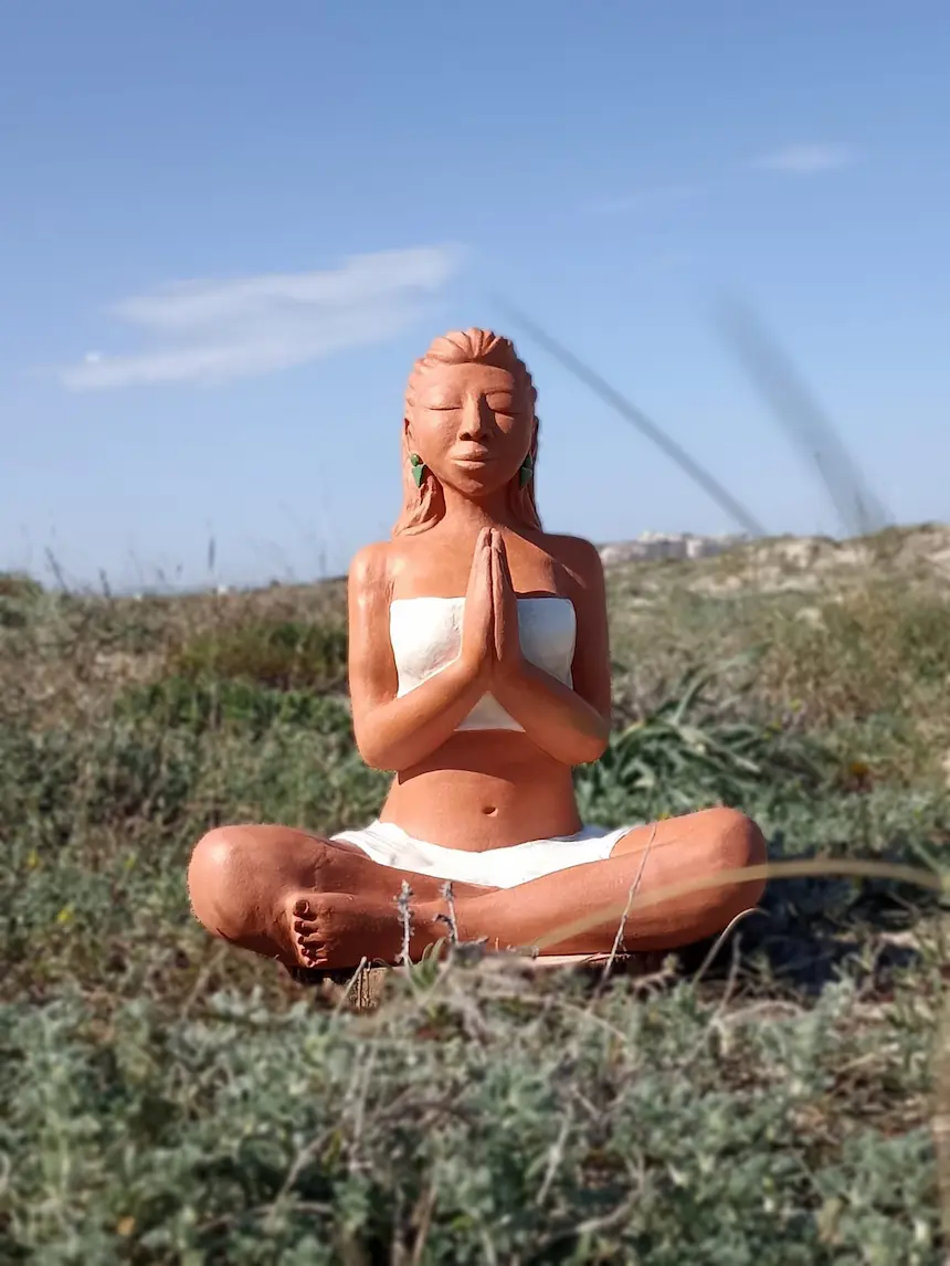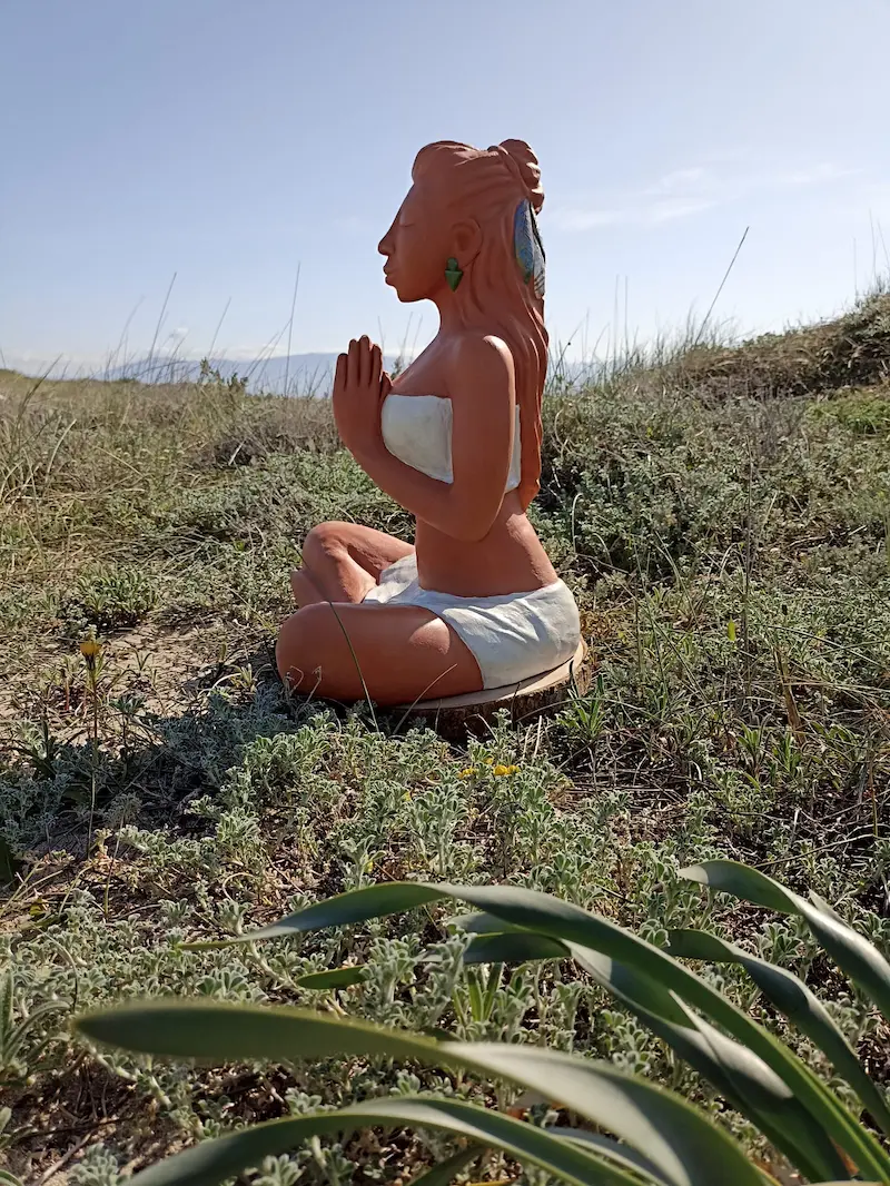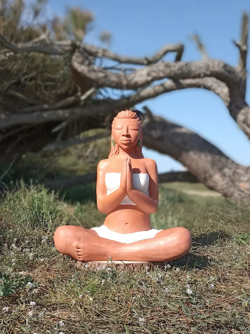 Dans sa posture de méditation profonde, Aponi rayonne d’une sérénité et d’un ancrage qui nous reconnectent à une part de nous où les émotions sont légères, douces, fluides et lumineuses. Des plumes sacrées, délicatement posées dans sa chevelure, symbolisent la connexion entre le terrestre et le céleste, entre notre humanité et notre essence spirituelle. Enveloppée dans un vêtement simple, elle nous invite à la contemplation et à l’instant présent.