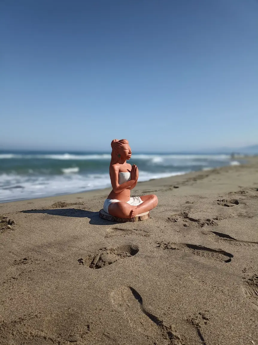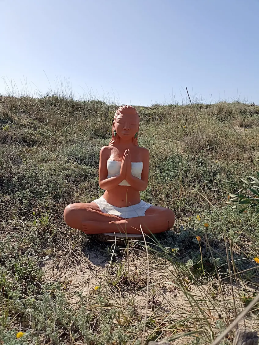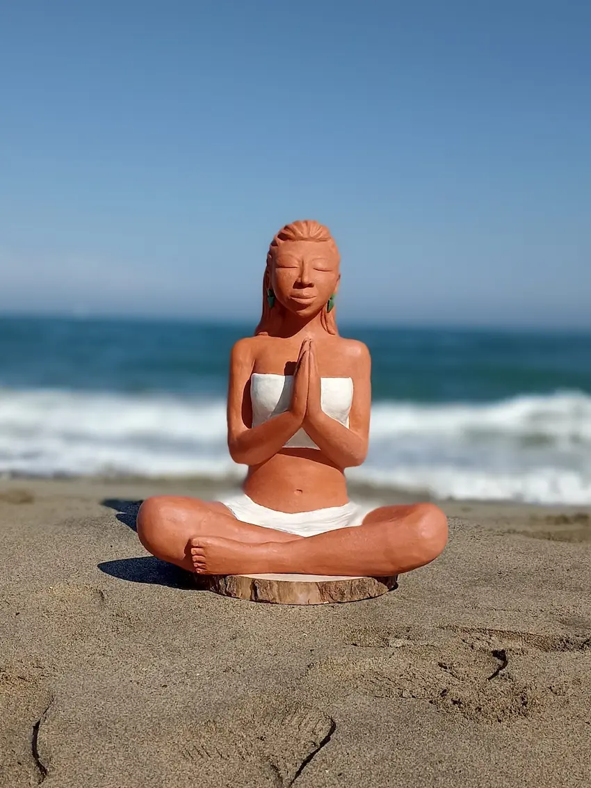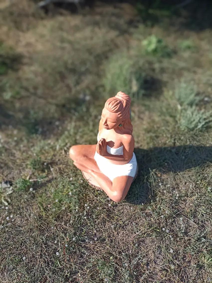 Dans sa posture de méditation profonde, Aponi rayonne d’une sérénité et d’un ancrage qui nous reconnectent à une part de nous où les émotions sont légères, douces, fluides et lumineuses. Des plumes sacrées, délicatement posées dans sa chevelure, symbolisent la connexion entre le terrestre et le céleste, entre notre humanité et notre essence spirituelle. Enveloppée dans un vêtement simple, elle nous invite à la contemplation et à l’instant présent.