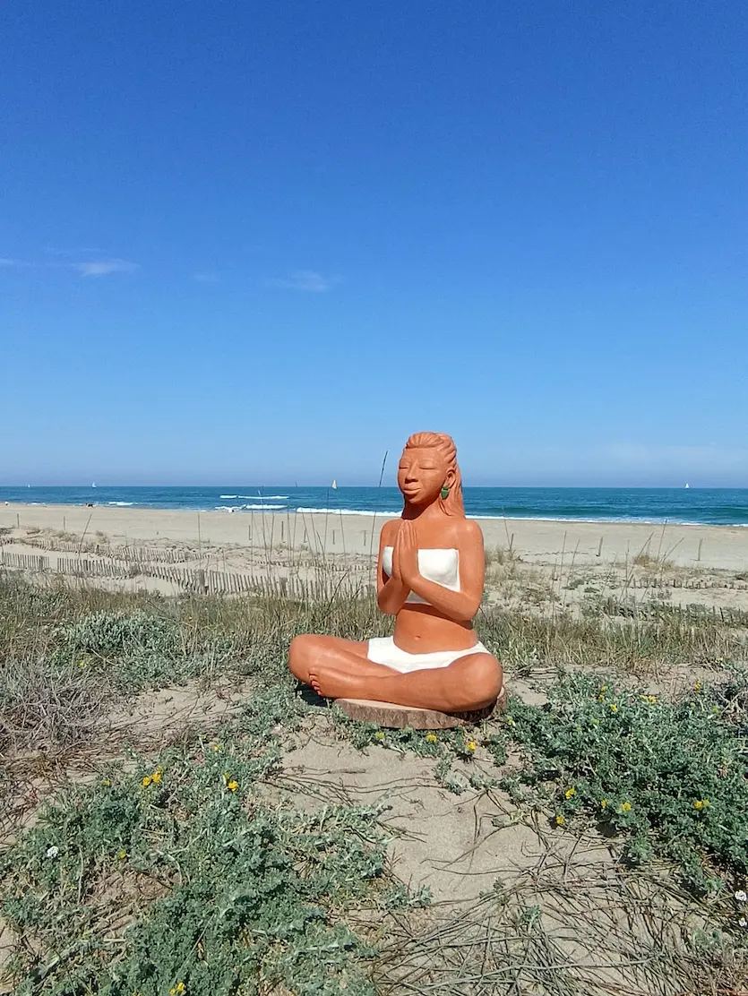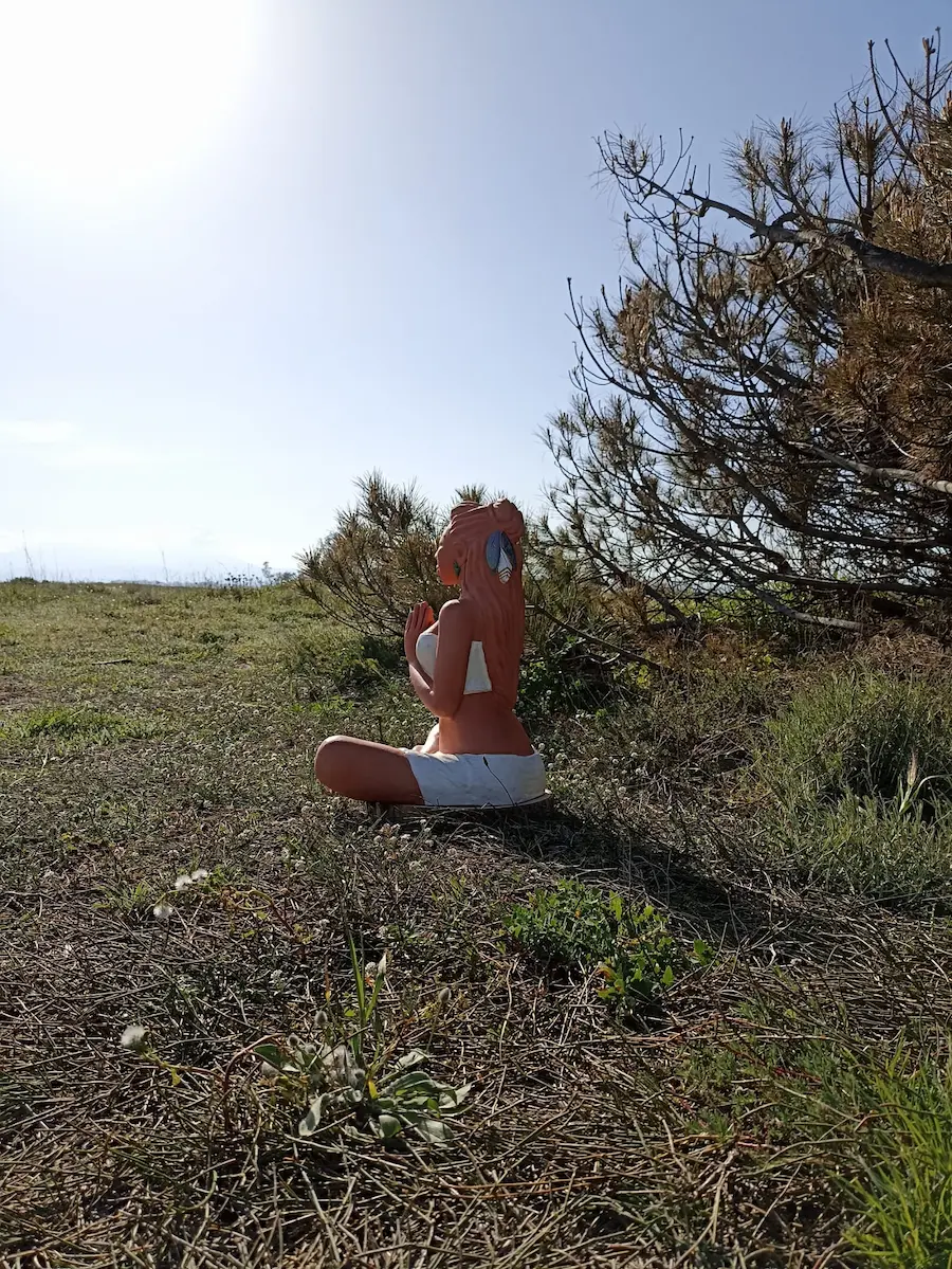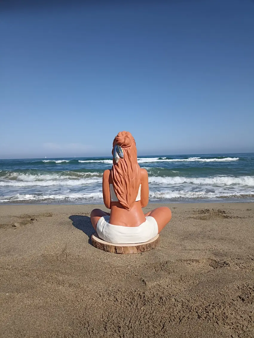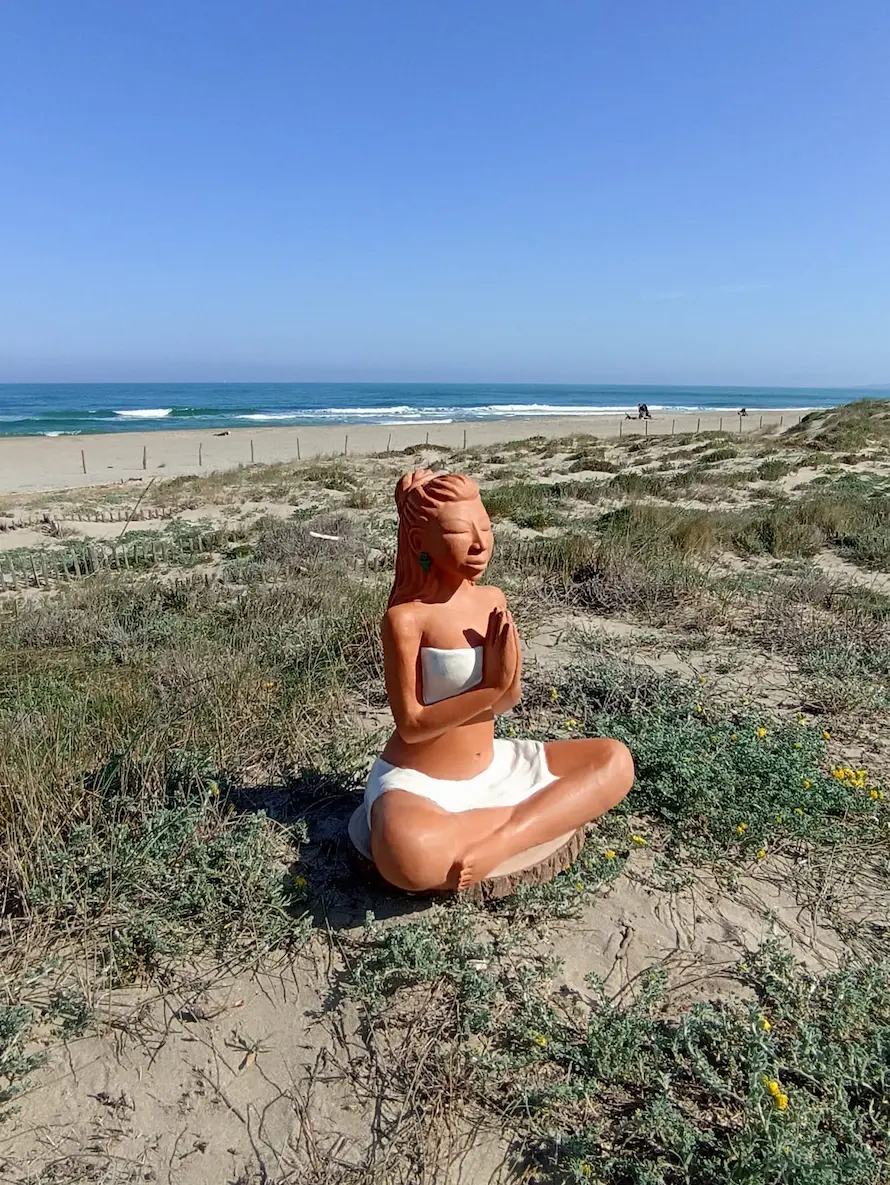 Dans sa posture de méditation profonde, Aponi rayonne d’une sérénité et d’un ancrage qui nous reconnectent à une part de nous où les émotions sont légères, douces, fluides et lumineuses. Des plumes sacrées, délicatement posées dans sa chevelure, symbolisent la connexion entre le terrestre et le céleste, entre notre humanité et notre essence spirituelle. Enveloppée dans un vêtement simple, elle nous invite à la contemplation et à l’instant présent.
