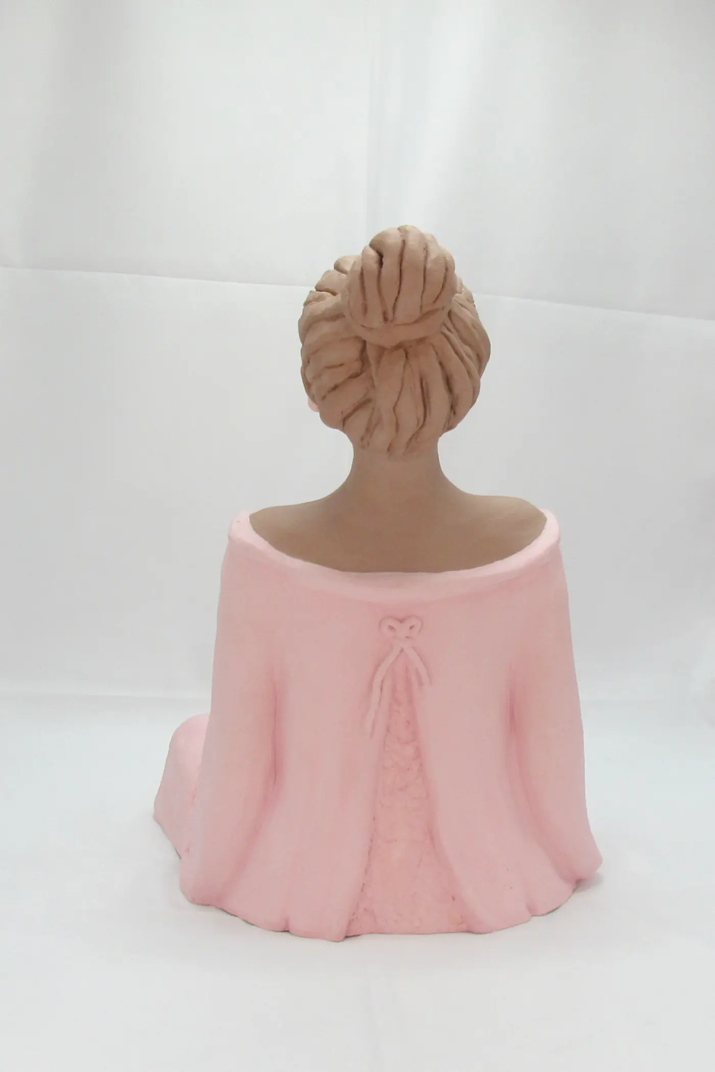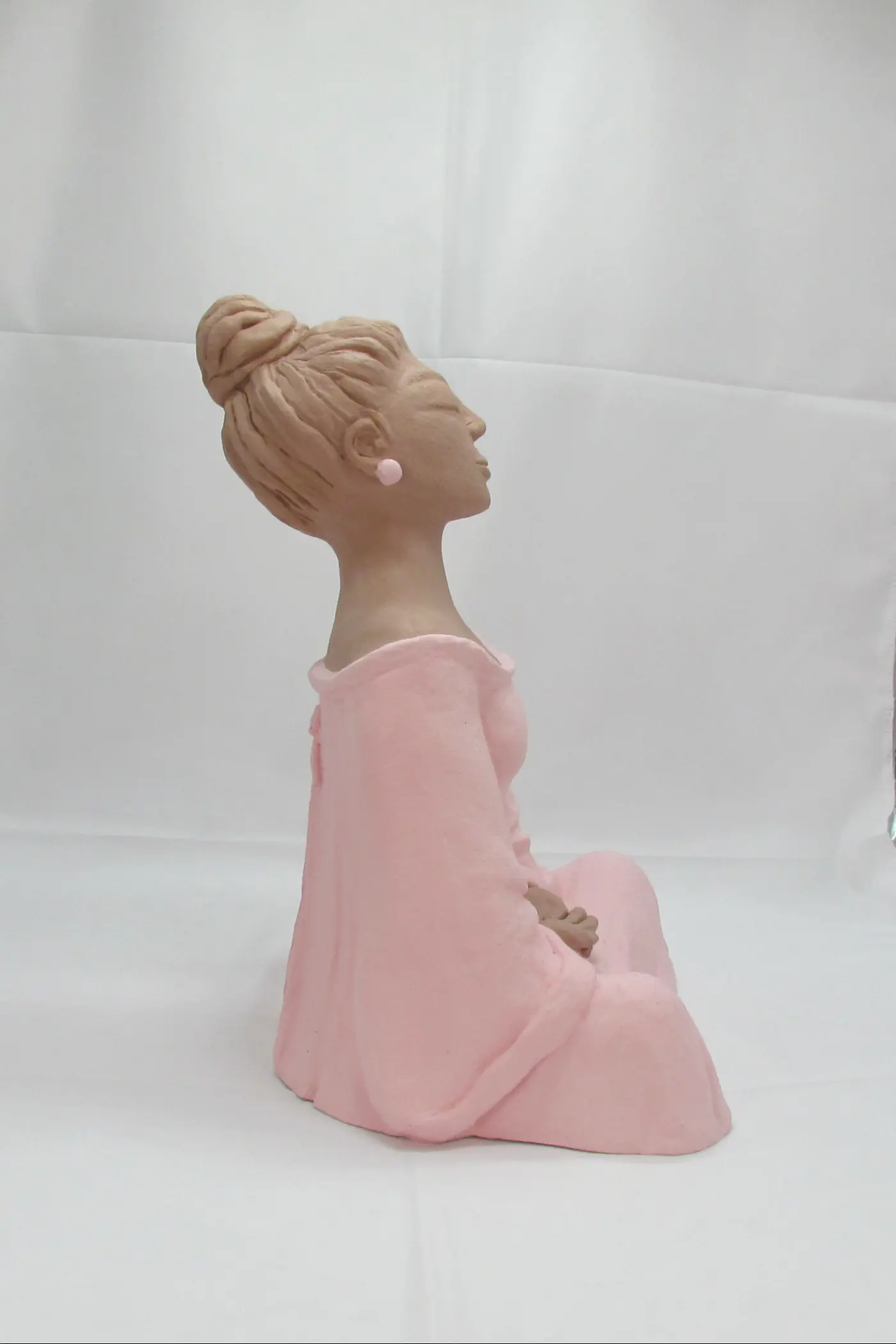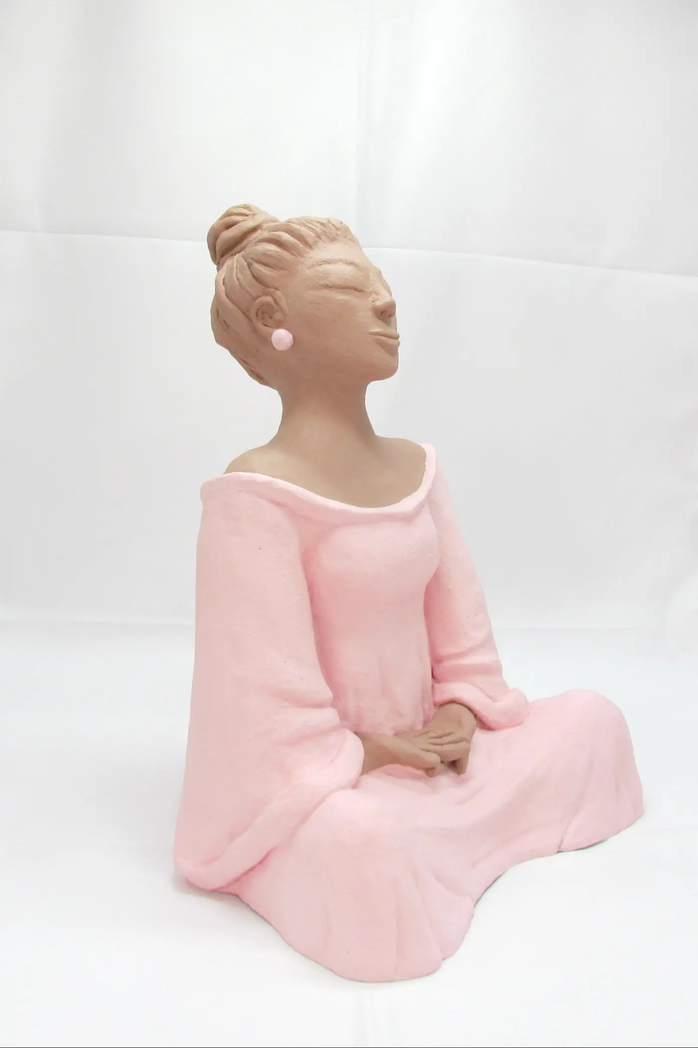 Hina se révèle ici dans une harmonie bicolore d’une délicatesse infinie. Le rose pâle enveloppe sa silhouette méditative tandis que le beige naturel habille son visage serein et ses mains jointes, créant un dialogue chromatique apaisant entre terre et tendresse, ancrage et douceur.