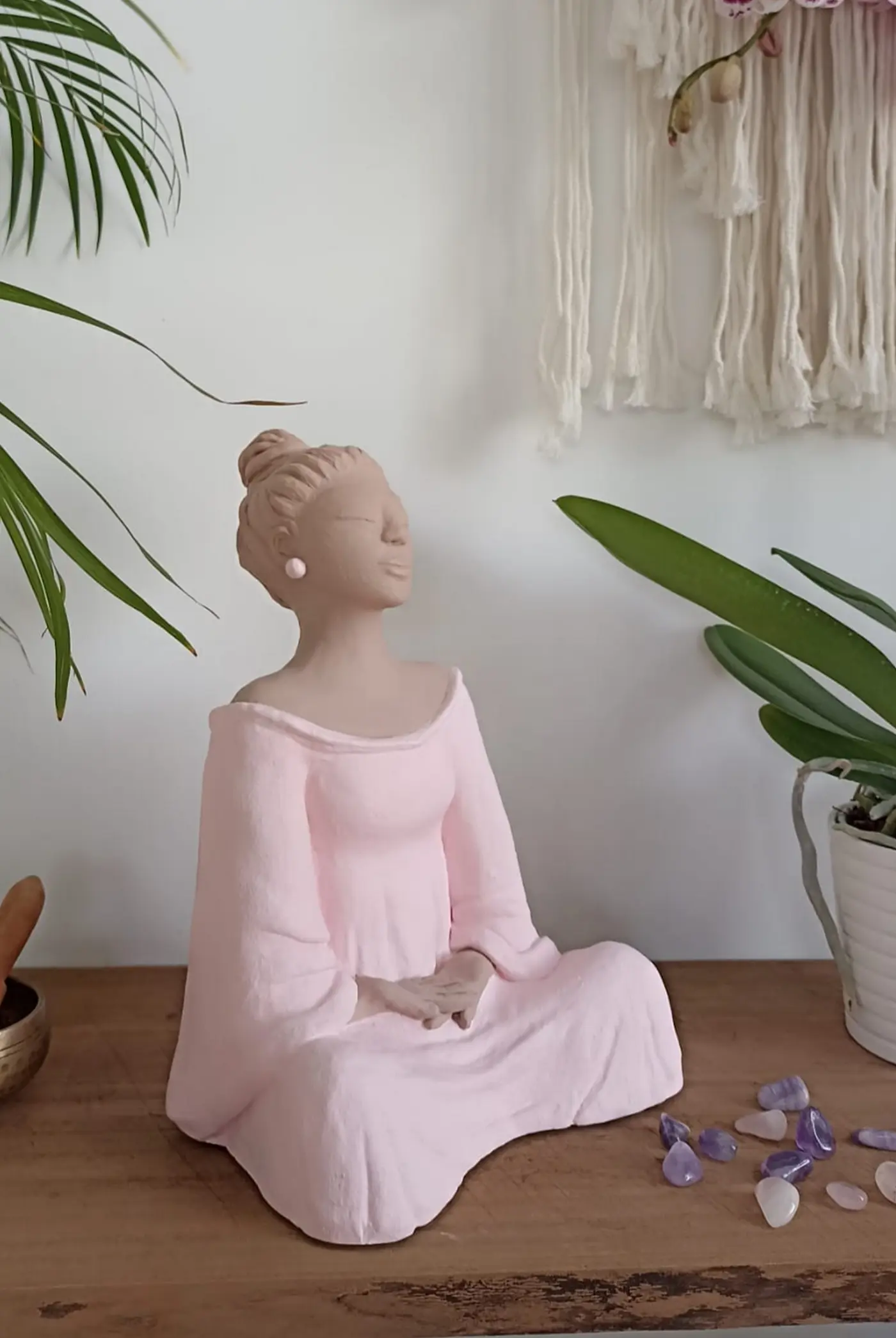 Cette version bicolore incarne l’équilibre parfait entre douceur et force, entre le féminin sacré (rose) et la connexion à la terre (beige). Dans sa posture méditative, elle apporte à votre intérieur une présence tendre, tel un cocon de sérénité.